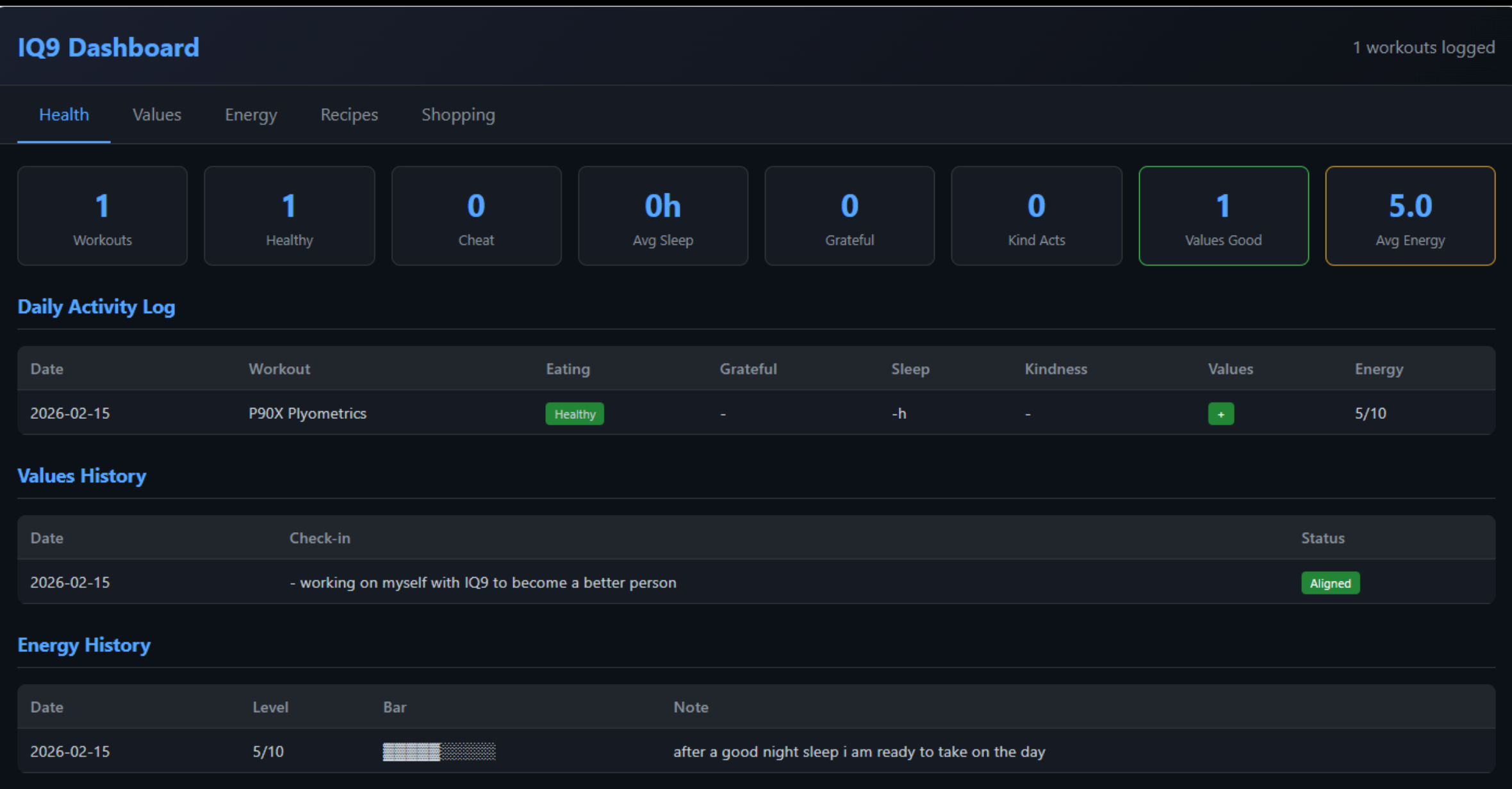 What you do not see is the interactions to get this data. It integrated telegram commands so I can log any of this information. It also created an automated check-in where it sends me messages asking, “Did you work out yet?” or “What is your mood?” etc. I can also use some commands used via telegram to log without being prompted. This was MVP1 (on Agent0) if you know, but they all ended up close to the same. What is interesting is that it created a calculation of how I am doing throughout the day. Yes, I only have one day of data, as it was just done yesterday.